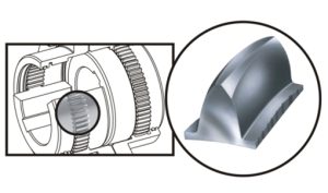 O abaulamento do topo, raiz e flanco dos dentes permite um engrenamento preciso e suave, acomodando desalinhamentos angulares, axiais e paralelos nos eixos conectados.