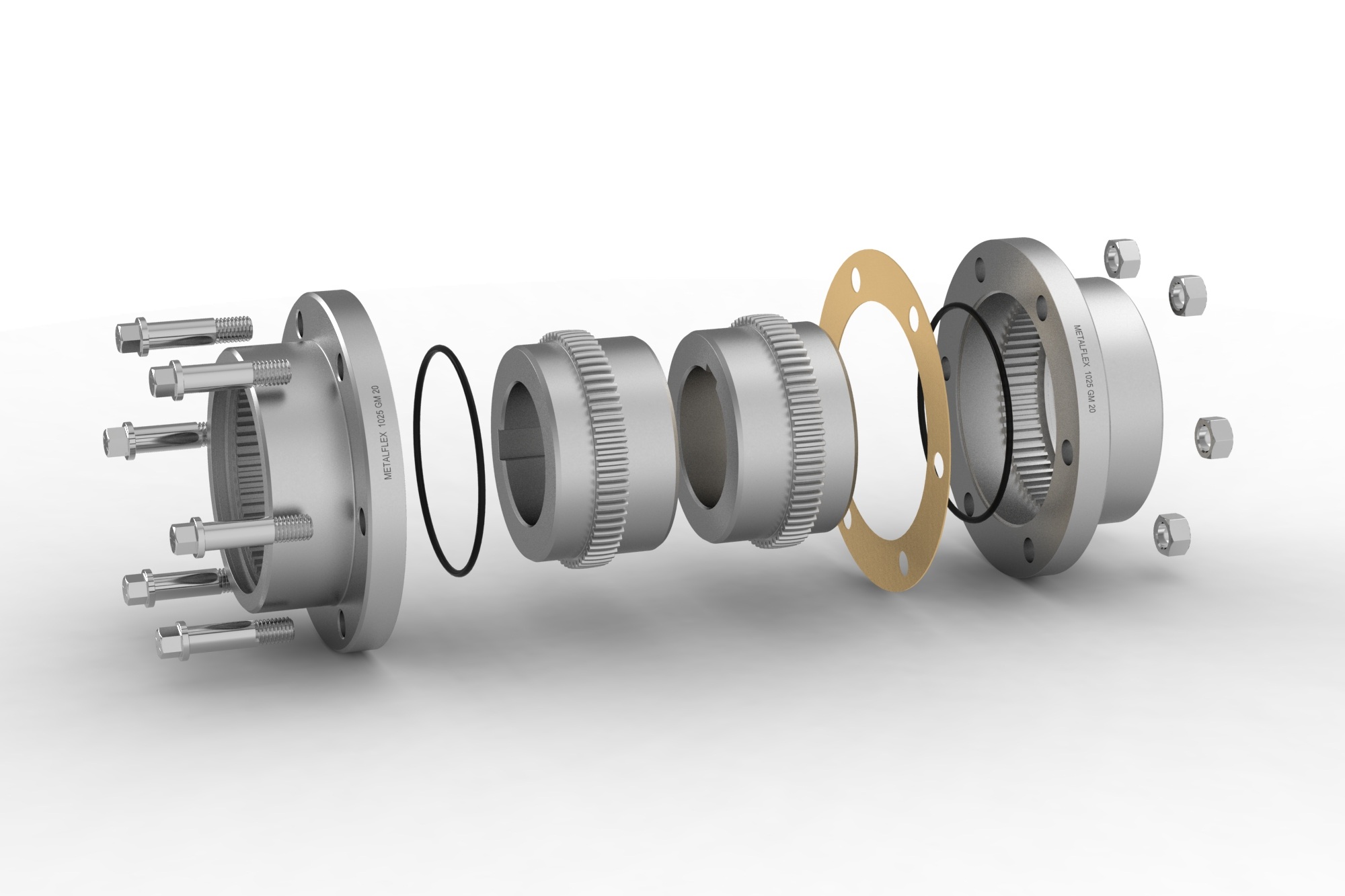 Acoplamento de engrenamento duplo projetado com duas metades flexíveis para acomodar desalinhamentos paralelo e angular. Disponível na versão standard com parafusos expostos (GM20) ou parafusos embutidos (GM10). Podem ser montados com um ou dois cubos em posição invertida.